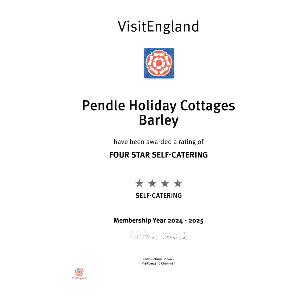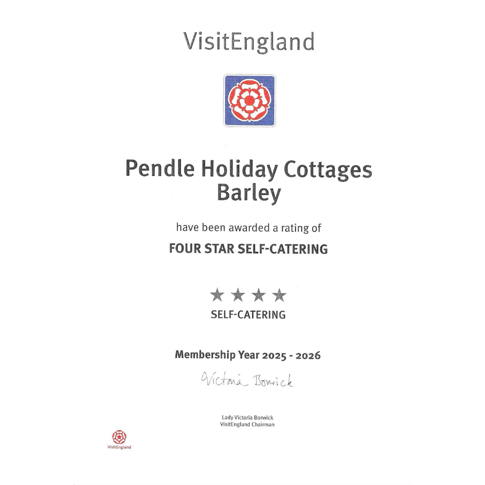 I am delighted to announce that Pendle Holiday Cottages has once again been awarded a Four-Star Self-Catering Rating by Visit England for 2025–2026. This continued recognition is a real honour and reflects our ongoing commitment to providing high-quality accommodation and exceptional experiences for our guests.